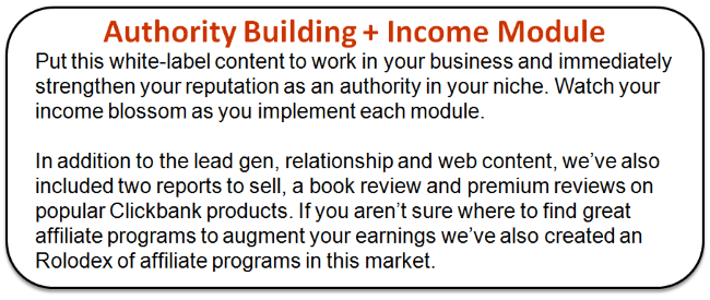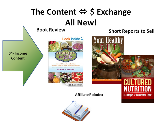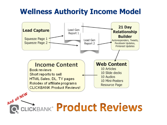 The Wellness Income Funnel consists of four layers of marketing content including book reviews, short reports, articles, HTML squeeze pages, lead gen & product banners, tweets, Facebook and Pinterest images, resources, and handy Rolodex file of programs available to affiliates.